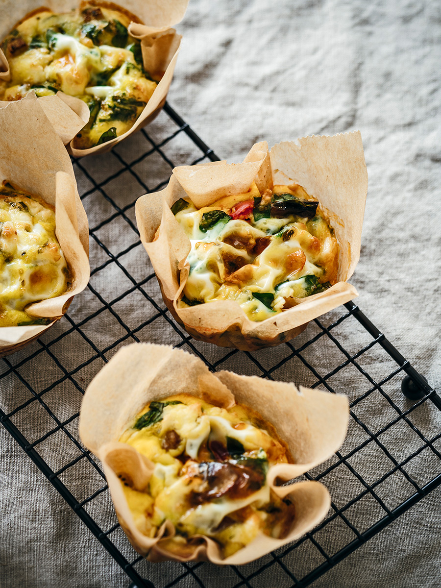 - Vet de holtes van de muffinvorm in met olijfolie of gebruik papieren bakvormen of bakpapier. Verdeel de geroosterde groenten, spinazieblaadjes en kaas over de holtes. Schenk het eimengsel erover en bak 15-18 min. in de oven, of tot het eimengsel net gestold is.